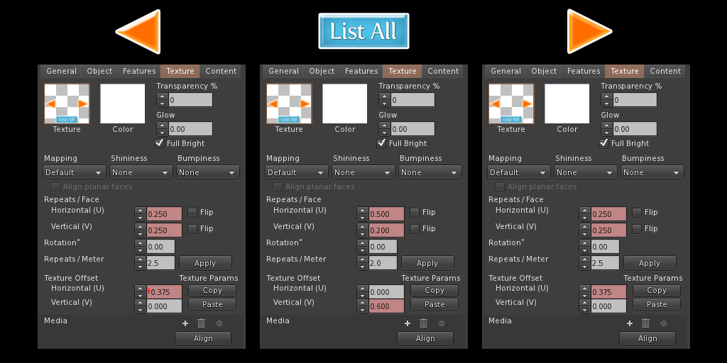 Tip: Fast Texture Loading – You'll notice that when you use textures for special items they will probably initially show up as gray and have to load in. This is due to SL's agressive texture caching. If the viewer doesn't need it, it throws it out. This can be extrememly annoying to potential customers who are trying to cycle through the vendor and want to see stuff right away.