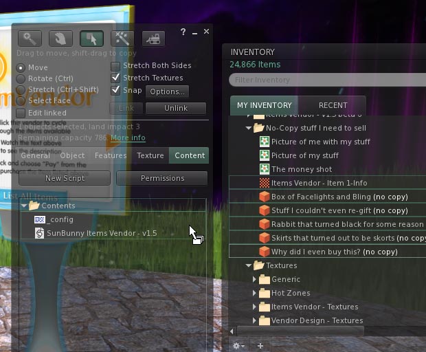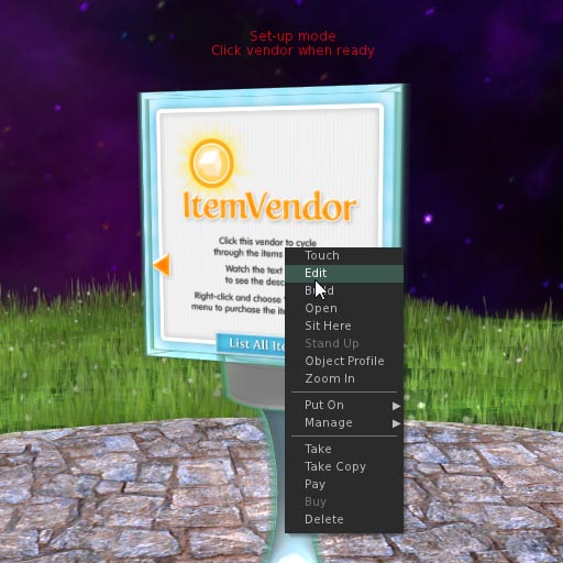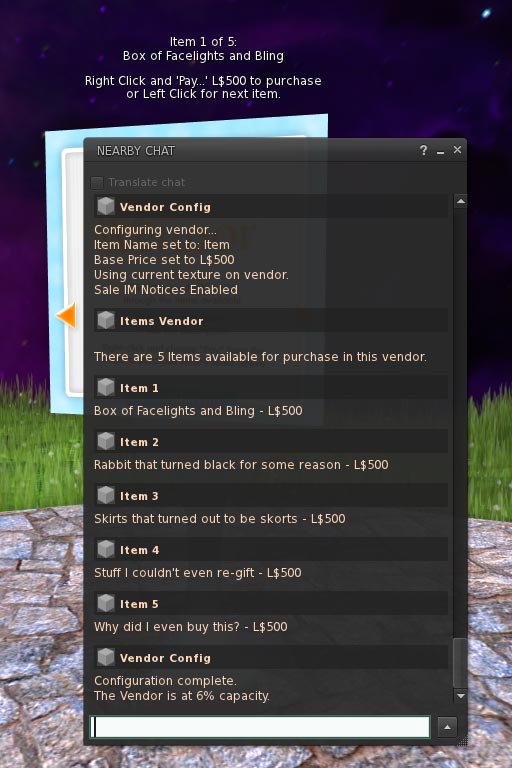 - Before you put anything in the vendor, make sure your items are NOT set for sale on the item itself. Your buyers won't be aware of this and when they rez the item it will still be set for sale!