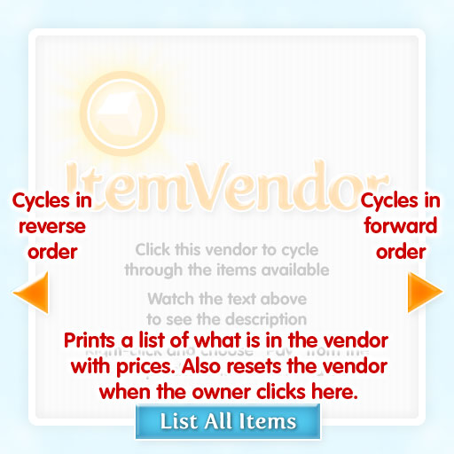 The interface to the vendor features Back & Forward buttons and a List All Items button. This button will also reset the item count and prices when the vendor owner clicks on it.