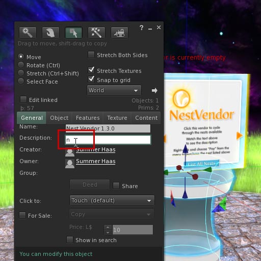 The Nest Vendor is comprised of a single script with an optional "_config" notecard. You can put a copy of the vendor script (and _config notecard if using that feature) in any of your objects making it into your own unique vendor. If you are using an irregular shape like a sphere or sculpted prim you will want to make sure the hot zones are where they should be for the "forward", "back" and "list all" buttons. You can download a template here: Nest-Vendor-Hot-Zones.png.